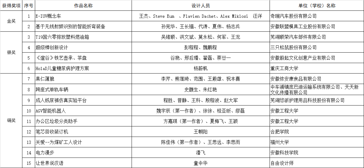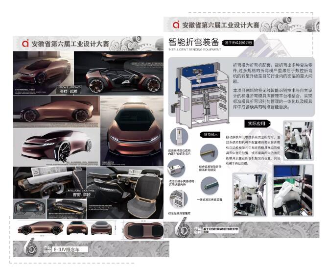 最終,來自奇瑞汽車的E-IUV概念車(概念設(shè)計)與安徽聯(lián)盟模具工業(yè)有限公司的基于無線射頻識別的智能折彎裝備( 實物產(chǎn)品)榮獲本次大賽金獎,從設(shè)計理念、產(chǎn)品外形、先進(jìn)技術(shù)在產(chǎn)品中的應(yīng)用以及解決行業(yè)痛點等關(guān)鍵問題上,以上作品在行業(yè)中均處于領(lǐng)先水平。同時,來自順榮股份、三只松鼠、美的冰箱、中車龐巴迪(蕪湖)、安徽工程大學(xué)、安徽工業(yè)大學(xué)等企業(yè)、高校投稿作品也在本次大賽中取得了優(yōu)異的成績。